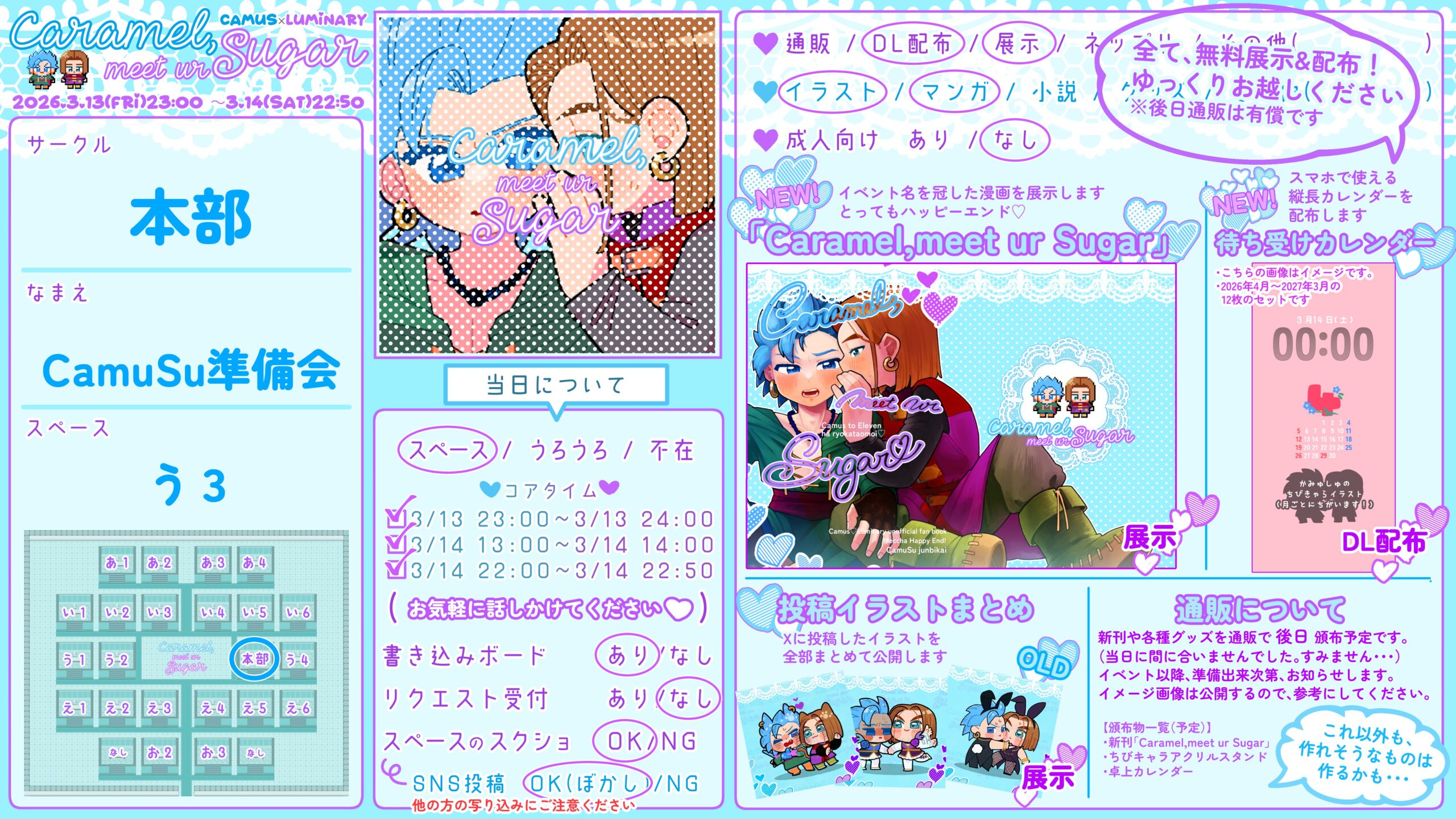 後日、同人誌やグッズの通販を行いますが、内容や使用する画像自体はほとんど無料で閲覧できるものになりますので、手元に置いておきたいものはぜひ通販で購入をお願いいたします。
